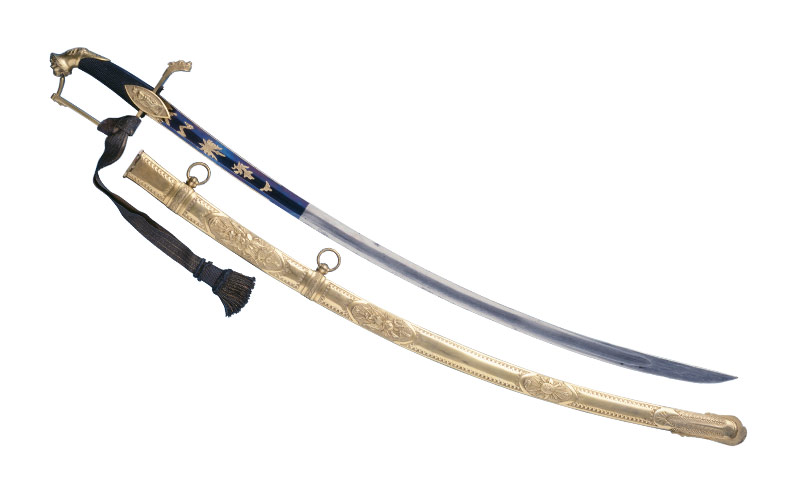 Rückenklinge (Länge 82,2 cm, Breite 3 cm), breiter Hohlschliff, Wurzeldrittel gebläut, vergoldeter Ätzdekor: Trophäen, Ornamente. Messingscheide, ziseliert und vergoldet, zwei Ringbänder, Schlepper. Scheidendekor: Vorderseite – je eine grosse Trophäe in drei Kartuschen von unterschiedlicher Grösse, Akanthusbordüren. Rückseite – weitgehend glatt, einfache punzierte Kreismuster. Schlagband: Goldband, Troddel mit Fransen.
