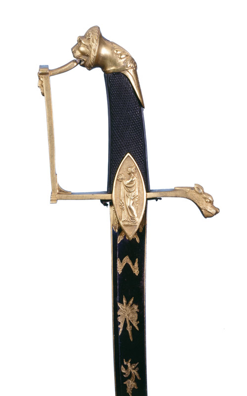 Messinggefäss, aus gegossenen und ziselierten Teilen zusammengesetzt, vergoldet. Knaufkappe mit Löwenkopfabschluss, der flache, vierkantige, oben und unten gewinkelte Griffbügel mündet in die ebenfalls flache, vierkantige Parierstange. Aussenseite des Griffbügel-Mittelstücks sechsfach gerillt, unterhalb der Oberkante Darstellung eines bärtigen Männerkopfs unter einem Kapitell. Die Parierstange endet in einem Phantasie-Tierkopf. Beidseitig grosse, spitzovale Mitteleisen, beidseitig gleicher Dekor: Frau in langem, altgriechischem Kleid, einen Blumenstrauss(?) präsentierend. Schwarzer, vierkantiger Ebenholzgriff, auf der Vorder- und Rückseite geschnittene Waffelmuster.