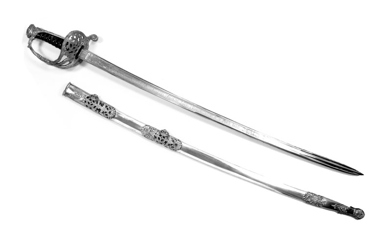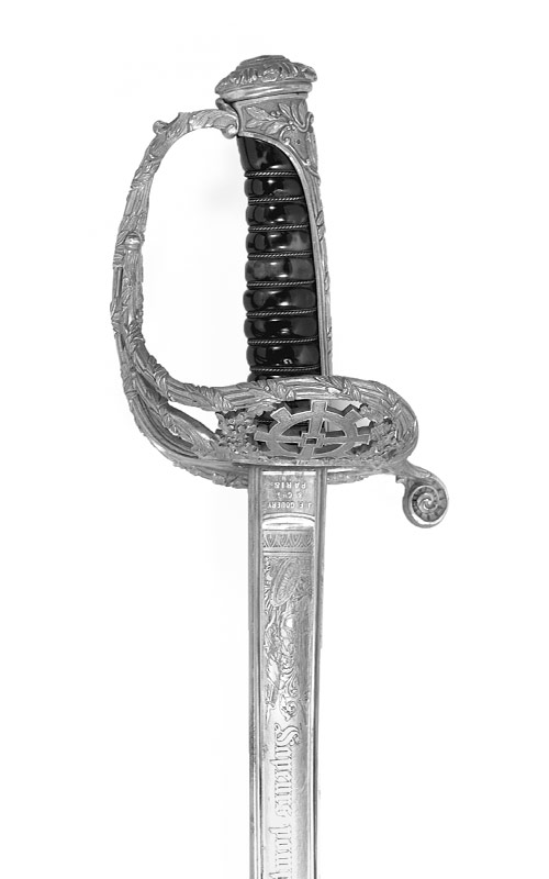 Rückenklinge (Länge 78,5 cm, Breite 2,8 cm), Klingenwurzel signiert «J. F. Gouéry & Cie à Paris», breiter Hohlschliff und Rückenkannelüre, Klinge im Ortviertel zweischneidig, Übergang in ein Hohlschliffpaar. Vergoldeter Ätzdekor: Widmung – «Sapeurs-pompiers de Mulhouse, au Capitaine Jean Zipélius, la Cie [Compagnie] de la Porte-haute./Honneur. Dévouement. 1834 – 1864. Estime. Reconnaissance», zwischen den Jahrzahlen «1834» und «1864» ein Mühlenrad. Stahlscheide, Messinggarnitur vergoldet, Mundblech mit Tragring, Ringband, beide durchbrochen gearbeitet, Dekor: im Zentrum jeweils ein Mühlenrad, dazu Ornamente und Blattwerk. Auch der Stiefel mit Schlepper ist durchbrochen gearbeitet. Schlagband: schwarze Kordel, zwei Gold-Troddeln mit Fransen, eine Schiebeschlaufe.