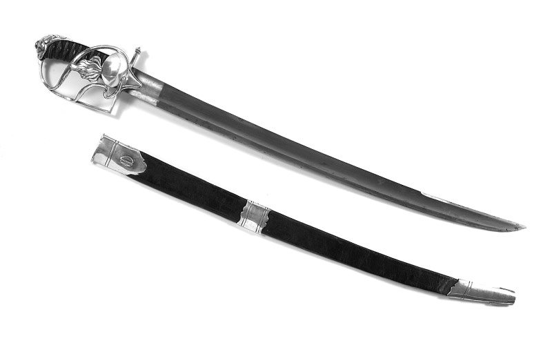 Zum Vergleich konnte der Säbel eines Grenadieroffiziers der Garde von ca. 1785/89, im Besitz des Historischen Museums Altdorf (Inv. E 4), der mit dem gleichen Gefässtyp ausgestattet ist, herangezogen werden. Das versilberte Messinggefäss ist im Gegensatz zur Unteroffiziersausführung verschraubt und auf dem Griffbügel «CASADO» signiert, die Lappen sind nicht rhomben- sondern halbkreisförmig. Die Kanten des achteckigen Holzgriffs wurden mit schmalen Silberschienen belegt. Die Rückenklinge (Länge 83,5 cm, Breite 3,3 cm) mit breiten Hohlschliffen, einer Rückenkannelüre, ist im Ansatzdrittel gebläut. Auf den 1778 ordonnanzmässig vorgesehenen goldtauschierten oder vergoldeten Ätzdekor hatte man verzichtet. Die Lederscheide mit einer versilberten Messinggarnitur (Mundblech mit Tragring, Ringband und Stiefel) ist ähnlich konzipiert und verarbeitet wie die Scheide für die Säbel der höheren Unteroffiziere, letzterer wurde in einer Tragtasche am Leibgurt getragen. Obschon in den Verordnungen immer wieder von «épée d’argent» oder «sabre d’argent» die Rede ist, wurden diese Waffen aus Kostengründen selten mit massiven Silbergefässen gefertigt, es dürfte sich daher auch bei den Offiziersausführungen in den meisten Fällen um versilberte Messinggefässe gehandelt haben. In seinem Inventar bezeichnet Carl Beck vermutlich gemäss Angaben des Verkäufers die Waffe als «Artilleriesäbel aus neapolitanischen Diensten, um 1850».