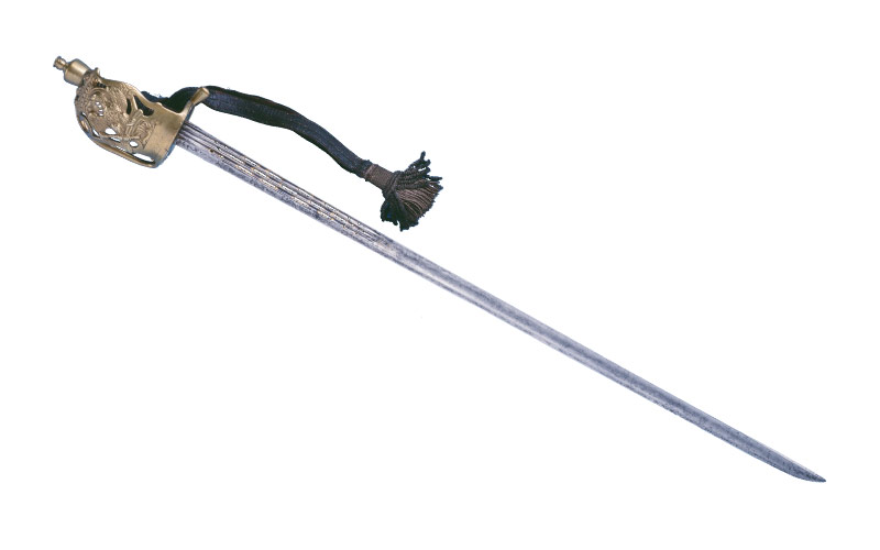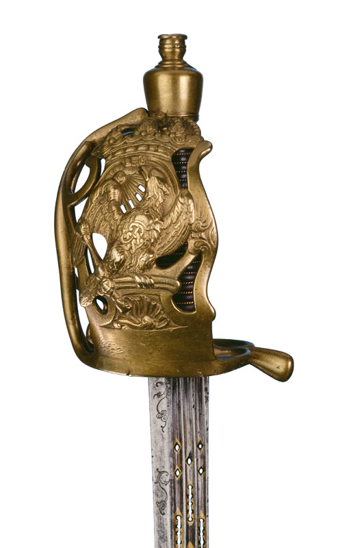 Messinggefäss, aus gegossenen und geschmiedeten Teilen zusammengesetzt, vergoldet, berieben. Konischer, vasenförmiger, oben gerundeter Knauf, Halsansatz, grosser Vernietknauf, der Griffbügel begrenzt auf der Vorderseite einen durchbrochen gearbeiteten Dreiviertelkorb, Dekor: der preussische Adler sitzt auf einer rocaillenverzierten Konsole, hält sich mit der linken Klaue und umklammert mit dem rechten Fang ein Szepter. Auf der Brust des Adlers das Monogramm FRW (König Friedrich Wilhelm III., 1797 – 1840), über dem Adler eine grosse Krone. Im Hintergrund eine kleine Sonne mit durchbrochen gearbeiteten Strahlen als Anspielung auf die gegen Ludwig XIV. von Frankreich gerichtete Devise des Soldatenkönigs Friedrich Wilhelm I. (1713 – 1740): «Non soli cedit». Zweiteiliges, aus nierenförmigen Hälften bestehendes Stichblatt, körperwärts mit Daumenbügel, kurzer Parierstangenfortsatz. Belederter, gerillter Griff (22 Rillen), Kupferdrahtwicklung.