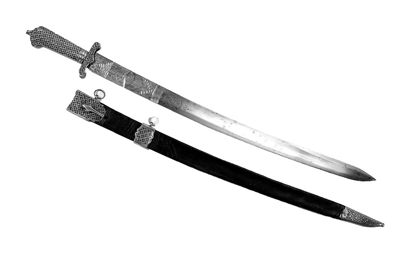 Leicht gebogene, volle Rückenklinge (Länge 58,3 cm, Breite 3,6 cm), im Ansatzdrittel geschliffener und geätzter Dekor. Schwarze Lederscheide, Eisengarnitur, Mundblech mit Traghaken und Tragring, Ringband, Stiefel. Auch die Scheidengarnitur ist auf der Vorderseite in der Art des Gefässes durchbrochen gearbeitet.