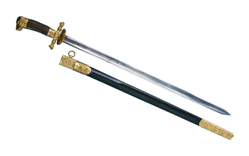 Gerade Rückenklinge (Länge 65,5 cm, Breite 2,8 cm), breiter Hohlschliff, Klingenwurzel mit Marke. Schwarze Lederscheide, Messinggarnitur vergoldet, Mundblech mit Tragring und Tragknopf, Dekor: Keiler von drei Hunden angegriffen, Eichenlaub, Öffnung für das fehlende Beimesser. Stiefel, Dekor: Hirsch, Hase und Kranich, Bordüren aus Eicheln und Eichenlaub.