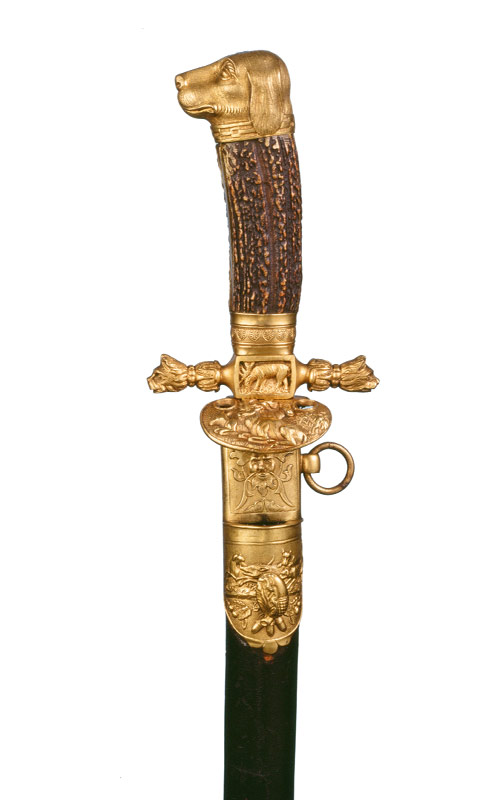 Messinggefäss, aus gegossenen, ziselierten Teilen zusammengesetzt, vergoldet. Knaufkappe in Form eines Hundekopfs mit langen Ohren. Den Abschluss der kurzen knospenartigen Parierstangenarme bilden Luchsköpfe, auf der quaderförmigen Parierstangenbasis erscheint die Abbildung eines äsenden Hirsches sowie eines Hundes. Kleines, ovales, etwas ortwärts gebogenes Stichblatt, Dekor: ruhender Hirsch mit zwei Hirschkühen. Die Angel ist mit Hirschornplatten belegt, eine Zwinge.