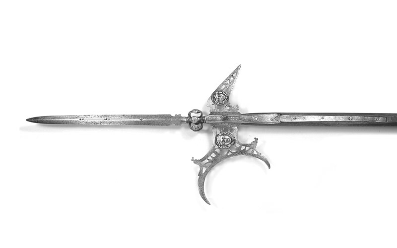Spitze in Form einer rhombischen Klinge (Länge 52 cm), im Mittelteil zwei lange, schmale Durchbrüche, an der Basis ein Kranz von sechs Dekorspangen, jede mit einem geschnittenen Maskaron. Ornamental durchbrochenes Blatt mit halbmondförmiger Schneide und breitem Halsansatz, auf der Blattober- und Unterkante je ein hakenartiges Zierelement. Schnabelhaken ebenfalls durchbrochen gearbeitet. Im Zentrum des Blattes und des Schnabelhakens wurde beidseitig auf gleicher Höhe ein gegossener Frauenkopf-Maskaron aus Messing mit Frauenkopf befestigt. Das Eisen weist im Bereich der Schaftführung einfache Dekorgravuren auf. Zwei Schaftfedern, Achtkantschaft, Rest einer grünen Bemalung, Stiefel.