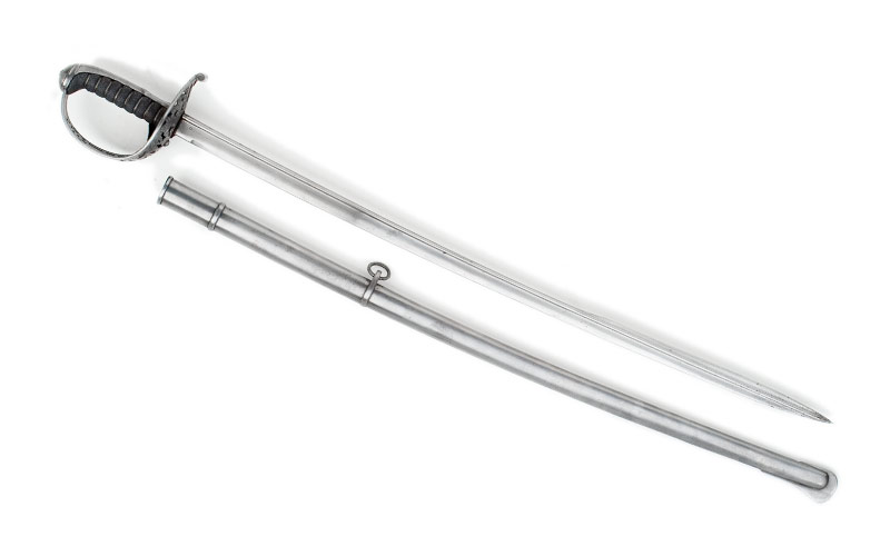 Rückenklinge (Länge 81,7 cm, Breite 2,7 cm), gesteckt mit Schör, signiert, «... WEYERSBERG, SOLINGEN», dazu Königskopfmarke, eidg.Kontrollstempel. Eisenscheide, Ösen- und Ringband. Schlagband eidg.Ord.1877/85 für Offiziere, sehr defekt.