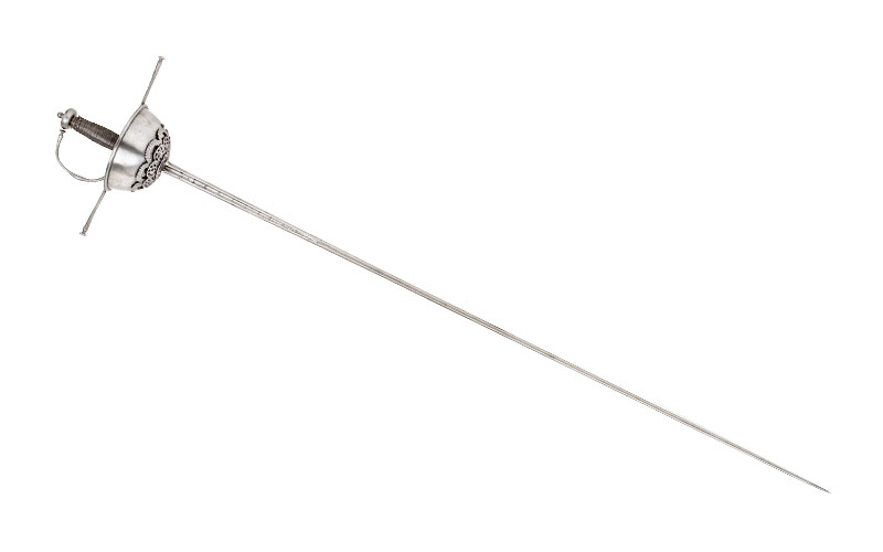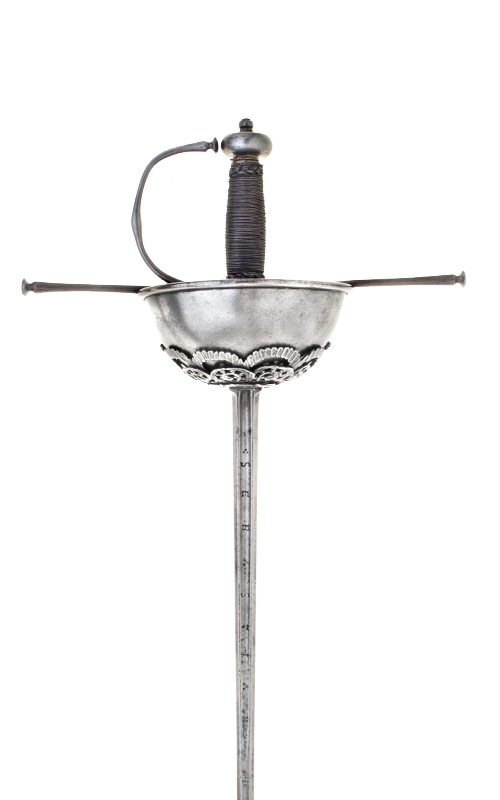 Solingen lieferte in der 2.Hälfte des 17.Jahrhunderts nebst Klingen in zunehmendem Masse auch komplette Griffwaffen nach Spanien. Obschon die Klinge der vorliegenden Waffe mit dem Namen von Sebastian Hernandez, einem sehr bekannten im 2.Viertel des 17.Jahrhunderts in Toledo tätigen Klingenschmied gezeichnet ist, handelt es sich mit grösserer Wahrscheinlichkeit um ein Solinger Erzeugnis. So fehlt die für Hernandez nachgewiesene, werkstattsbezogene Schlagmarke. Die während der Blütezeit dieser Rapierart vor allem im 3. Viertel des 17. Jahrhunderts festzustellende, umgebogenen Aussenkante der Schale kam die Aufgabe zu die gegnerische Klingenspitze aufzufangen und zu brechen. Diese spezielle Kantenart, der sogenannte Brechrand, erhielt in Spanien die Bezeichnung , «rompe-puntas», in Frankreich, «brise-point». Anstelle der Schalenkante dienen bei der vorliegenden Waffe auf der Aussenseite der Glocke angebrachte, durchbrochen gearbeitete Eisenbleche als Klingenfänger. Ein Schalenrapier in der Slg.D.José Estruch y Cumella (Nr.702) mit der Signatur des Solinger Meisters Wihelm Dinger, dessen Alter 1700 mit 50 Jahren angegeben wird, ist mit einer vergleichbaren Schale ausgestattet. Wobei diese sowohl über einen Brechrand als auch eine kleine, aufgesetzte «Brechscheibe» verfügt. Ein weiteres Exemplar in der Slg. Estruch y Cumella (Nr.677) scheint nur über die kleine «Brechscheibe» zu verfügen. Wie ein Schalenrapiers in der Towersammlung zeigt, dienten auch auf der Glocke um die Klingenwurzel herum vernietete oder aufgelötete, wulstige Eisenringe als Klingenfänger. Weil bei Schalenrapieren nachweislich spanischer oder italienischer Fertigung diese kleinen «Brechscheiben» oder «Brechringe» auf der Glockenaussenseite bisher nicht festgestellt werden konnten, scheint es sich um eine deutsche «Erfindung» zu handeln. Allgemein ist darauf hinzuweisen, dass die oftmals durchbrochen gearbeiteten Gefässe nicht nur ästhetische Ansprüche befriedigen mussten, sondern mit ihren Durchbrüchen in begrenztem Umfang auch einem klingenbrechenden Einsatz dienlich waren. Vgl. Kommentare und Literatur zu den Schalenrapieren B 657, 673.