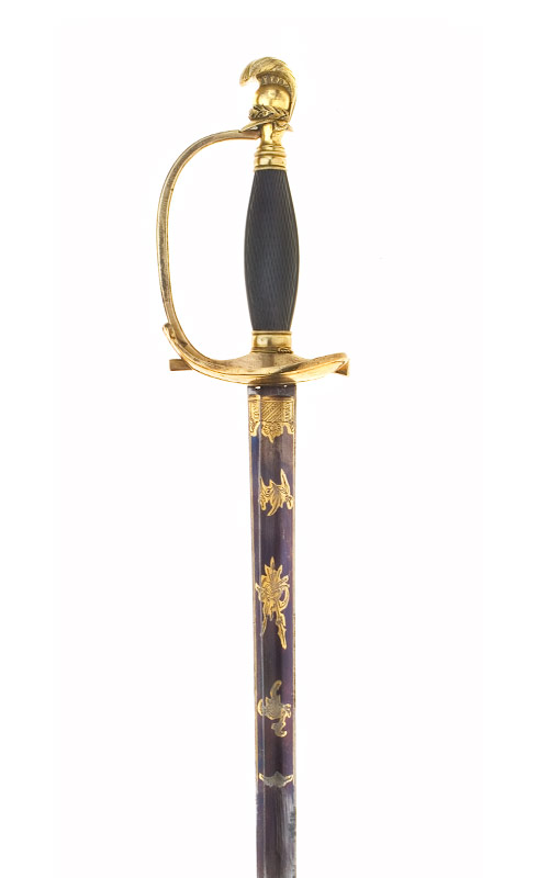 Der Degen entspricht einem Modell, das am 16. Juli 1818 in Bern der eidgenössischen Militäraufsichtsbehörde vorlag, welche im Begriff war, die für das Bundesheer gemäss eidgenössischem Reglment von 1817 verbindlichen Musterwaffen festzulegen. Man bemängelte den «Degenknopf» (= Knauf), der durch den «Helm mit Federbusch allzu sehr geschmückt und scharf» sei, wodurch die Uniform in Mitleidenschaft gezogen werde. Am 18.Juli entschied die eidgenössische Militäraufsichtsbehörde, dass der im Auftrag der Artilleriekommission und des Berner Zeughauses von Degenschmied Nikolaus Rudolf Schönauer (1775-1848) hergestellte Degen mit Helmknauf als «fakultatives» Modell zu genehmigen und damit für die Kantone nicht als verbindlich zu erklären sei. Es war denn auch vor allem Bern, das seit 1818 den neuen fakultativen Offiziersdegen mit Helmknauf propagierte; andere Kantone z.B. Zürich, Solothurn, Aargau, Thurgau, St.Gallen usw. folgten dem bernischen Beispiel. Der Entwurf eines «Reglementes für die Bewaffnung der bernerischen Miliz» von 1830 von Aide-major Gouzy, das wegen des liberalen Umsturzes von 1830 nicht mehr gedruckt werden konnte, enthält die detaillierte Beschreibung eines ordonnanzmässigen Artillerie-Offiziersdegens, der auch von den übrigen unberittenen Berner Offizieren verwendet wurde: