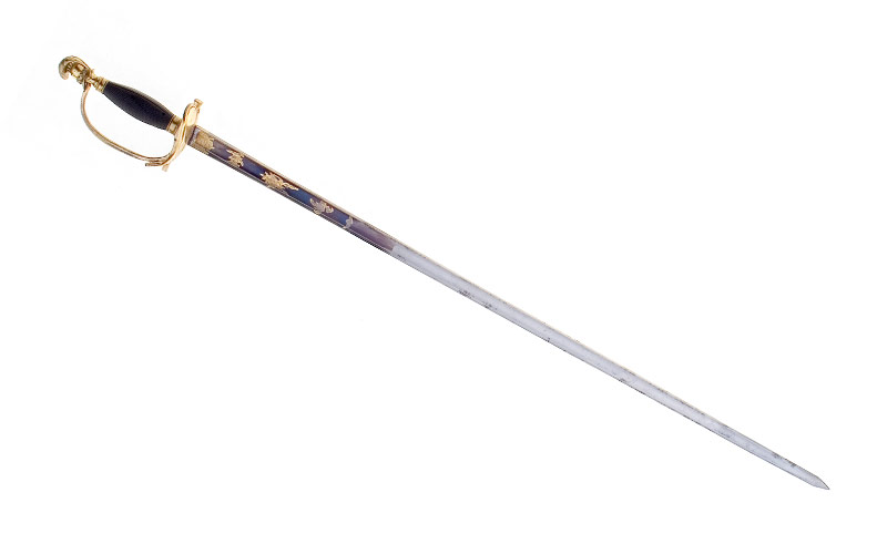 «Ein Degen mit Griff von schwarzem Holz nebst Bogen und Stichblatt von vergoldetem Messing; der Griff ist zwischen dem Bogen 4 Zoll lang, die Weite zwischen demselben und dem Bogen beträgt 1½ Zoll, das Stichblatt bildet eine 8 Linien tiefe Schaale und ist in seiner grössten Breite 2 ¼ Zoll breit. Die Klinge ist gerade, an jeder Seite ein wenig ausgehöhlt, 2 Schuh 7 Zoll [83,9 cm] lang, oben 10 Linien breit und daselbst am Rücken 3 Linien dick. Die Scheide ist von schwarzem Leder, ihre Garnitur ist von vergoldetem Messing und besteht in einem 3 Zoll 5 Linien langen, mit einer Schleifschiene versehenen Ortband und einem Mundstücke, das auf der innern Seite 1 Zoll, auf der äussern aber 2 Zoll lang und daselbst mit einem Knopfe versehen ist.»