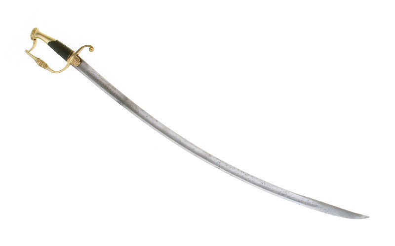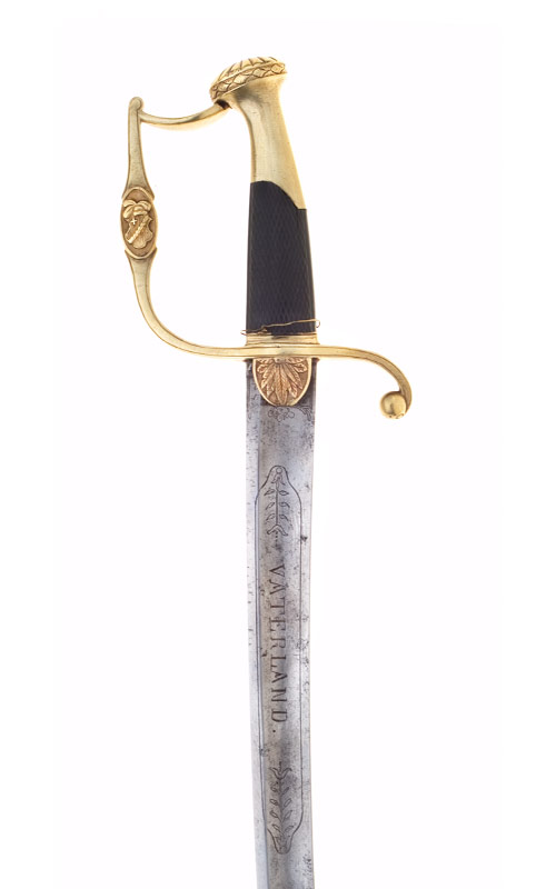 Messinggefäss vergoldet, berieben. Lange, vierkantige Knaufkappe mit ovalem, scheibenförmigem, dekoriertem Aufsatz, der zweiteilige Griffbügel besteht oben aus einem flachen, breiten Steg, der in den vierkantigen Bügelteil mündet, in einem ovalen Medaillon erscheint terzseitig das vom Freiheitshut überhöhte Schwyzer Wappen als Griffbügeldekor. Der Griffbügel geht in die flache, vierkantige Parierstange über, deren leicht ortwärts gebogener Arm in einer Kugel endet. Die halbrunden Lappen weisen nur terzseitig einen aus Blättern bestehenden Dekor auf. Vierkantiger Ebenholzgriff, Vorder- und Rückseite mit geschnittenem Fischhautmuster, Seitenflächen glatt.