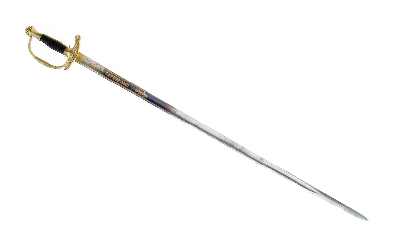Messinggefäss vergoldet, berieben. Halbkugeliger Knauf mit langem Halsansatz, die Knauffläche nimmt als Dekor eine zwölfblätterige Rosette ein. Der vierkantige Griffbügel mündet in die Parierstange, als Abschluss des kurzen Parierstangenarms dient eine stilisierte Blattknospe. Zweiteiliges Stichblatt, nierenförmige Hälften, die quartseitige Hälfte mit Palmettendekor ist leicht knaufwärts, die terzseitige, grössere Hälfte ortwärts gebogen, sie zeigt im Zentrum ein Liktorenbündel zwischen Eichenlaub und Palmzweigen. Der Dekorgrund ist fein punziert. Vierkantiger Ebenholzgriff, Vorder- und Rückseite mit geschnittenem Fischhautmuster, Seitenflächen glatt, Zwinge.