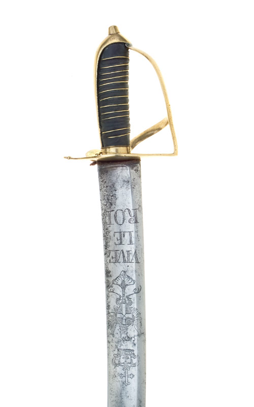 Rückenklinge, teilweise korrodiert (Länge 62,3 cm, Breite 4,1 cm), volle Wurzel, breiter Hohlschliff, Ätzdekor: Terzseite - Tatzenkreuz, Trophäe, Quartseite - Beschriftung, «VIVE LE ROI», darüber ein grosser Adler, dessen Körper das Savoyerwappen bedeckt, von Krone überhöht.