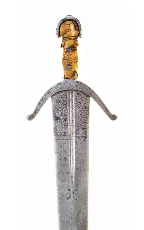 Zweischneidige Klinge (Länge 65,3 cm, Breite 6,9 cm), rhombischer Querschnitt, Ansatzviertel beidseitig mit Mittelkannelürenpaar und Marke: Zwei gespiegelt angebrachte kurze Bogen, deren Aussenseite kurze Dreikantzacken aufweisen. Die Bogendenden markieren drei geschlagene Punkte, welche ein Dreiblatt bilden. Der Ätzdekor bedeckt nur die Hälfte des vom Mittelkannelürenpaar eingenommenen Klingenteils und besteht zur Hauptsache aus einer links und rechts der Kannelüre platzierten Kartusche mit ornamentalen Blattwerk.