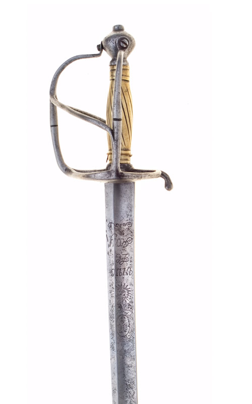 Eisengefäss, gequetschter, kugeliger Knauf mit konischem Ansatz, Vernietknauf. Griff- und separater Seitenbügel, beide im Knauf verschraubt, sind durch eine diagonale Spange miteinander verbunden und münden in die Parierstange resp. die Stichblattfassung. Quartseitig zwischen Griffbügel und Stichblattfassung eine weitere Spange sowie ein Daumenbügel. Kurzer, ortwärts gebogener Parierstangenarm. Auf der Parierstangenoberseite die gravierte Zahl «2». Bügel und Spangen aus Rundeisen unterschiedlicher Dicke. Zweiteiliges Stichblatt, die nierenförmigen Bleche, einseitig etwas zugespitzt, in Rundeisenfassungen fixiert, weisen Zierlochungen auf. Aus Messing gegossenes Griffstück mit vertikalen leicht schräg angeordneten Zierrillenpaaren, imitierte Zwingenabschlüsse.