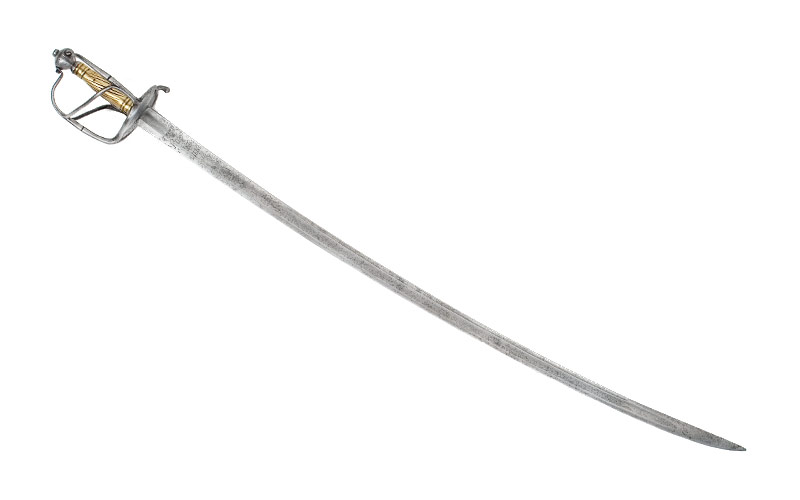 Die Säbel der Soldaten des Schweizerischen Garderegiments in französischen Diensten waren bis um 1748 mit Eisengefässen ausgestattet und wurden von einem einheitlichen Modell aus Messing abgelöst. Das vorliegende Exemplar unterscheidet sich durch eine lange Klinge und einem massiven gegossenen Messinggriff von den bisher bekannten Griffwaffen dieser Eliteeinheit. In Frankreich waren in jener Zeit besonders lange und relativ schmale Klingen für Grenadiere, Mannschaft und Offiziere, üblich ( Vgl. Be 182 ) Ein weiterer Säbel dieses Typs mit einer 1745 datierten Klinge befindet sich im Historischen Museum Thurgau (Inv. T. 41449) in Frauenfeld. Sowohl bei gewissen Schweizer Regimentern in französischen als auch in holländischen Diensten waren in der Zeit von ca. 1740 bis 1748 Säbel mit Eisengefässen, im Knauf verschraubten Bügeln, gelochten Stichblatthälften sowie messingenen Griffhülsen in Gebrauch. Die Messinggriffe erwiesen sich als bedeutend stabiler und strapazierfähiger als die bisherigen mit Draht umwickelten Holzgriffe.