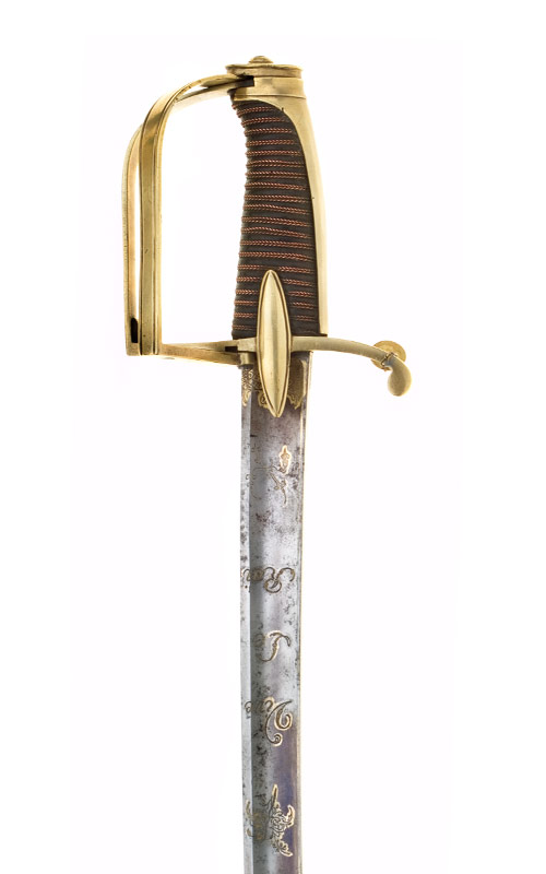 Rückenklinge (Länge 80,7 cm, Breite 3 cm), breiter Hohlschliff, Klingenrücken in der Orthälfte gerundet, Ansatzhälfte gebläut, berieben, vergoldeter Ätzdekor: Terzseite - Beschriftung, « Vive le Roi», Blütenzweige. Quartseite - ein Adler, dessen Körper das Savoyerwappen bedeckt, von Krone überhöht, Trophäe, Blütenzweige.