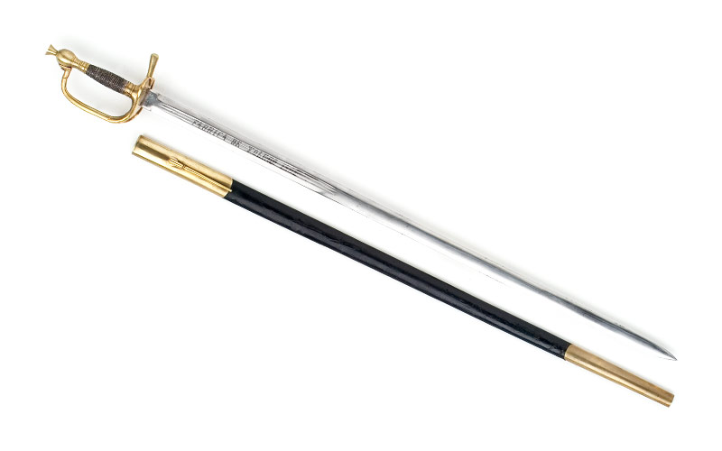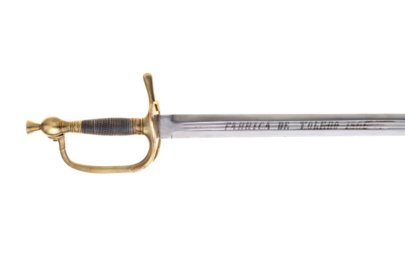 Zweischneidige Klinge (Länge 84,9 cm, Breite 2,8 cm), volle Wurzel, Ansatzdrittel mit drei Mittelkannelüren, dann sechskantiger Querschnitt, beidseitig grosse, gravierte Signatur, «FABRICA DE TOLEDO 1860». Geschwärzte Lederscheide, Messingggarnitur, vergoldet, berieben, Mundblech mit langem Traghaken, Stiefel.