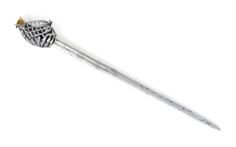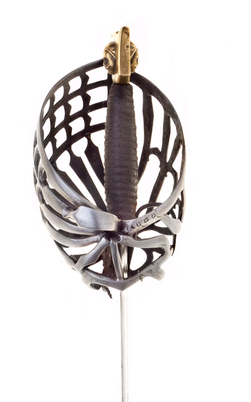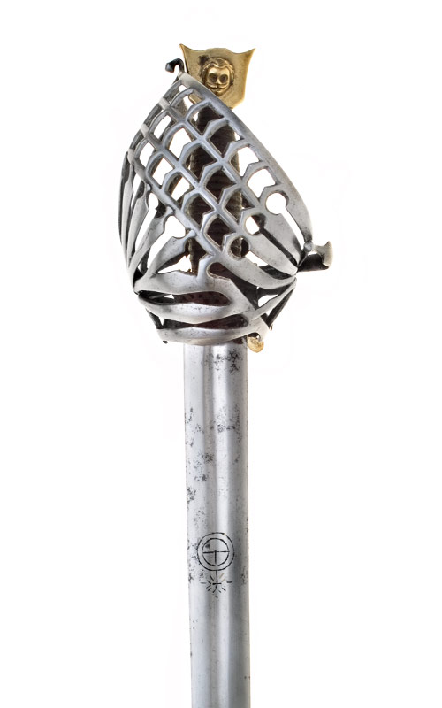 Eisengefäss, gegossener Messingknauf, flache, konische Form mit Kanten und schmalen Seitenflächen. Knaufbasis beidseitig gewinkelt, im Bereich der Nietfläche beidseitig spitz endend. Im Zentrum des Knaufs beidseitig ein Dekorbuckel in Form eines Männerkopfs mit Schnauz. Gegitterter Korb, terzseitig des Griffbügels eine dreifache Gitterreihe mit sieben Öffnungen über fünf Spangen sowie zusätzlichen Bügeln. Quartseitig sechs Spangen sowie an der Basis weitere Parierbügel und ein Daumenbügel, gravierte Signatur in kyrillischer Schrift, «SAVA». Vierkantige Parierstange mit einem flachen, korbwärts gebogenen Ende. Mit braunem Leder bespannter, gerillter Griff. Die Ledermanschette über der Klingenwurzel ist fragmentarisch erhalten.
