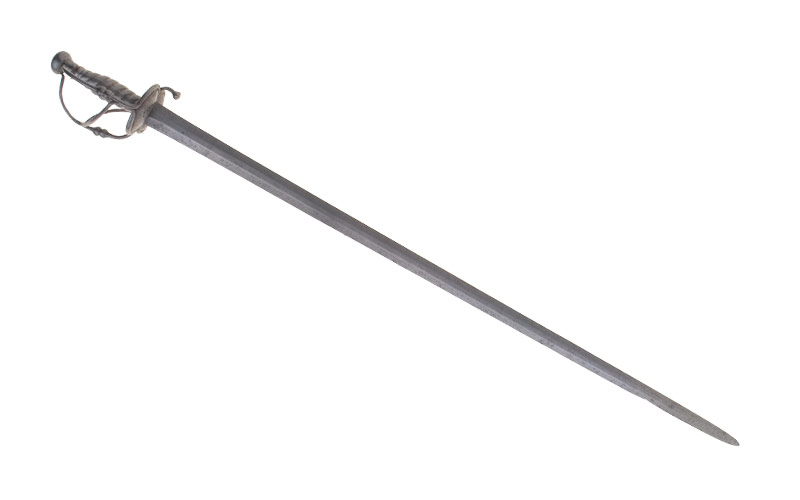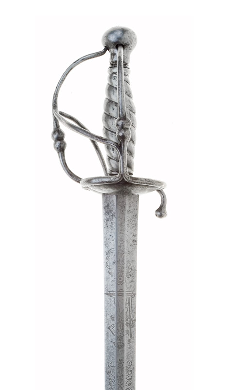 Eisengefäss, kugeliger Knauf mit konischem Ansatz, Griff- und separater Seitenbügel sind durch eine diagonale Spange miteinander verbunden und münden in die Parierstange resp. das Stichblatt. Griff- und Seitenbügel aus Rundeisen weisen als Dekor je ein kleines Kugelpaar auf. Eine weitere quartseitige Spange stellt die Verbindung zwischen Griffbügel und Stichblattfassung her, quartseitig ein Daumenbügel. Zweiteiliges Stichblatt, die nierenförmigen in Rundeisenfassungen fixierten Stichblattbleche weisen feine Zierlochungen auf. Aus Zinn gegossenes Griffstück mit spiralig angeordneten Rillen und Wulsten.