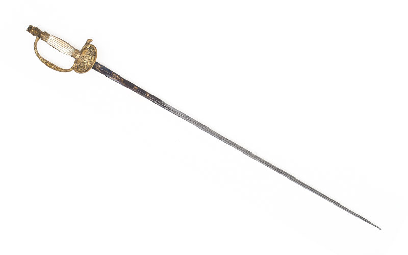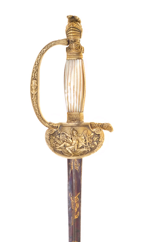 Messinggefäss, aus gegossenen und ziselierten Teilen zusammengesetzt, vergoldet. Knaufkappe mit vierkantiger Basis, darüber die plastische Wiedergabe eines Visierhelms samt Kragen, verzierte Helmglocke mit Kamm und Federschmuck. Der Helm ist terzseitig frontal ausgerichtet. Der flache, vierkantige Griffbügel, terzseitig mit einem Athenakopf zwischen Blüten und Blattwerk dekoriert, endet in der Griffbasis. Die langviereckige Kartusche der Griffbasis schmückt quartseitig ein geflügeltes Blitzbündel. Der Abschluss des kurzen Parierstangenarms hat die Form eines Widderkopfs. Auf dem ortwärts gebogenen, konkaven, schildförmigen Stichblatt erscheint im Zentrum als geharnischter Krieger, der Gott Mars, dessen rechte Hand auf einem Schild ruht, und der in der Linken eine Statuette der Siegesgöttin hält. Beidseitig des Kriegers antike römische Standarten und Waffen. Der vierkantige Griff wurde auf der Vorderseite mit vertikal gerillten, auf der Rückseite mit glatten, Perlmuttplatten belegt, seitlich dekorierte Messingschienen, Zwinge.