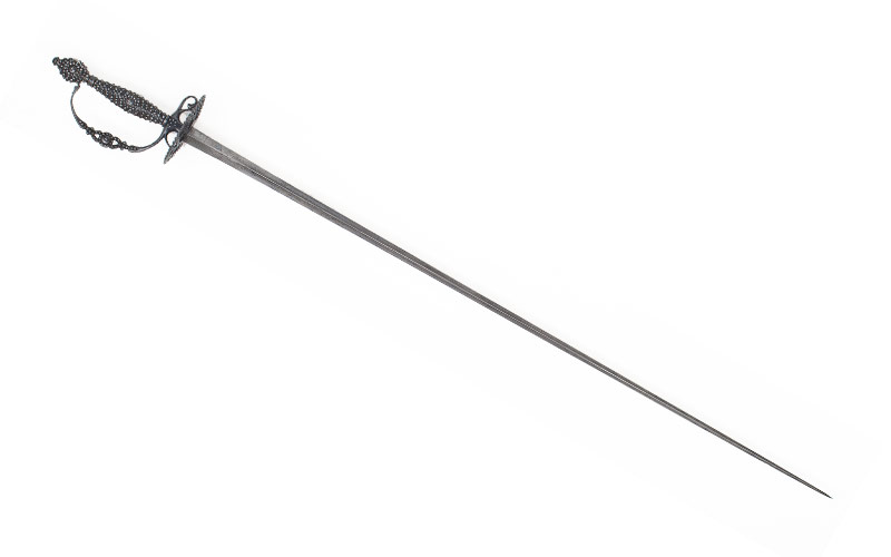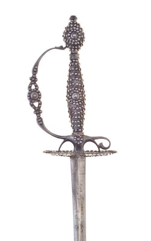 Stahlgefäss, aus geschmiedeten, nachträglich geschliffenen und durchbrochenen Teilen zusammengesetzt, aufgenieteter aus facettierten Stahlkügelchen bestehender Dekor. Olivenförmiger Knauf, Halsansatz, Vernietknauf. Feiner Griffbügel, im breiten und flachen Mittelteil ein durchbrochen gearbeitetes einfaches Ornament, terzseitig mit Stahlkügelchen. Der Bügel mündet in die Griffbasis. Das Ende des kurzen Parierstangenarms wurde eingerollt, Zierbügelpaar. Auf der Oberseite, des ovalen, durchbrochenen Stichblattes mit symmetrisch angelegten Motiven, einer achtblätterigen Rosette im Zentrum sowie acht Bogen und Stegen vor einer umlaufenden Bordüre, wurden Stahlperlen aufgenietet. Die kolbenförmige Griffhülse und der Knauf sind en suite dekoriert. Um eine grössere, zentrale Zierniete gruppierte man beidseitig chevronförmig geschnittenene Bahnen, die alternierend mit aufgereihten Stahlkügelchen verziert wurden.