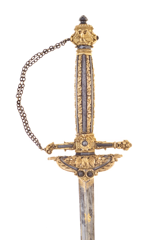 Messinggefäss, aus gegossenen und ziselierten Teilen zusammengesetzt, vergoldet, aus schmalen Stahlschienen und facettierten Stahlkügelchen bestehende Einlagen. Gequetschter, rundlicher Knauf über einer Basis mit einem facettierten Zierring aus Stahl. Terz- und Quartseite des Knaufs mit einer Darstellung des auf einem Blitzbündel sitzenden kaiserlichen Adlers, seitlich Blattmotive mit einem eingesetzten Stahlkügelchen. Im Zentrum der ovalen Nietfläche ein pilzförmiger Vernietknauf aus facettiertem Stahl. In die verzierten Parierstangenarme wurden auf der Terzseite Stahlschienen eingenietet. In der Griffbasis über einer achteckigen Stahlunterlage platzierte man eine weitere Stahlkugel. Das durchbrochen gearbeitete Stichblatt besteht aus zwei ungleich grossen, gewölbten Hälften, welche dem Ort zugebogen sind. Der zentrale Dekor der terzseitigen Stichblatthälfte besteht wiederum aus dem kaiserlichen Adler zwischen Rankenwerk, eingerahmt von Stahlschienen und Stahlkügelchen.