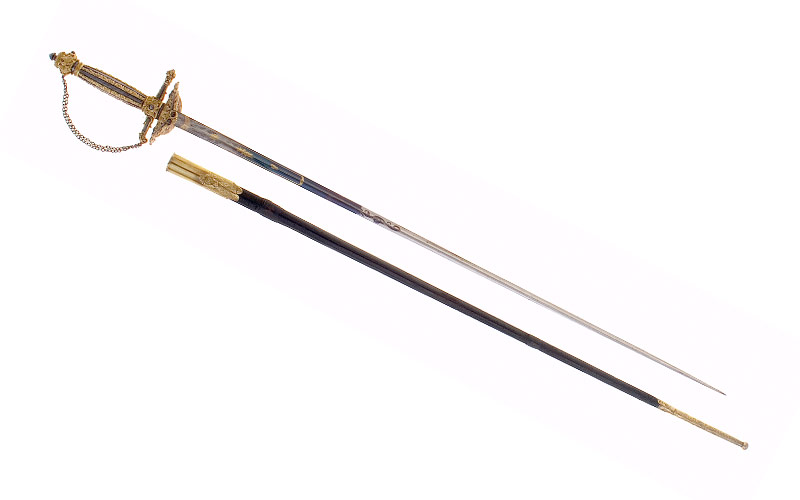 Dreikantige Klinge (Länge 75,5 cm, Breite 1,8 cm), tief gekehlte Seitenflächen, Ansatzhälfte gebläut, berieben, vergoldeter Ätzdekor: Signatur, «S.H.S.», Trophäen, Blütenzweige. Schwarze, sehr defekte Lederscheide, Messinggarnitur vergoldet, ziselierter Dekor, Mundblech mit Tragknopf, Stiefel mit Ortknopf.