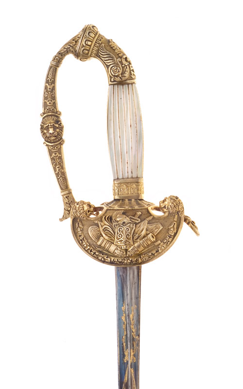 Messinggefäss, aus gegossenen und ziselierten Teilen zusammengesetzt, vergoldet. Gebogene, längliche Knaufkappe, Dekor bestehend aus einem angeschnittenen Blitzbündel, darüber Akanthusblätter, seitlich Blattmotive mit Blüten, als Knaufabschluss eine Eierstabbordüre. Der flache Griffbügel, welcher der Knauffläche entspringt, mit einem Löwenkopfdekor im Mittelteil, mündet in die ebenfalls flache Parierstange mit Palmettenabschluss. Das ortwärts gebogene, schildförmige Stichblatt mit Löwenkopfabschlüssen und feinem Punktgrund schmückt eine Trophäe aus antikem und zeitgenössischem Kriegsgerät über einer Eichenblättergirlande. Den vierkantigen Griff belegte man auf der Vorder- und Rückseite mit vertikal gerillten Perlmuttplatten, seitlich Messingschienen, Zwinge.