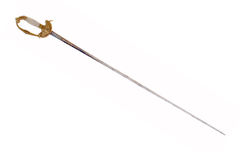 Dreikantige Klinge etwas fleckig (Länge 84,.2 cm, Breite 1,9 cm), tief gekehlte Seitenflächen, Ansatzdrittel gebläut, berieben, vergoldeter Ätzdekor: Signatur, « Coulaux Frères Klingenthal», Trophäen und Rankenwerk.