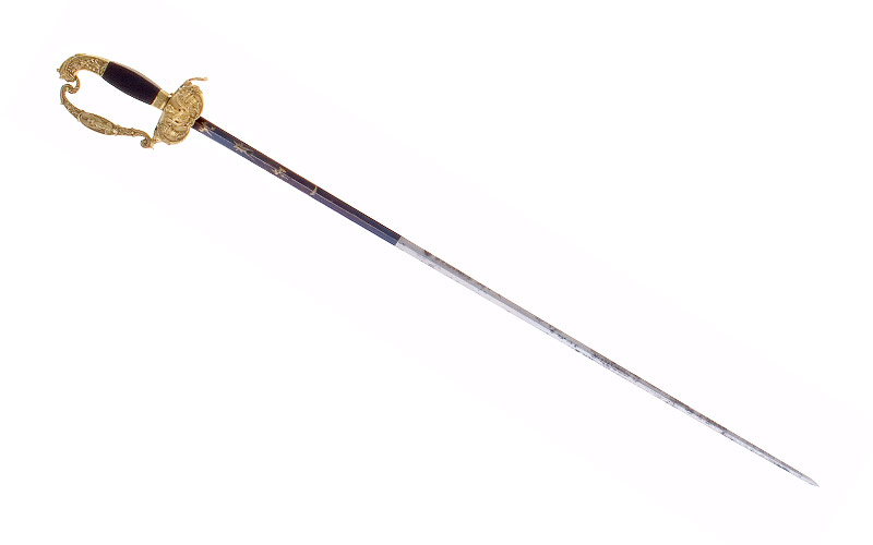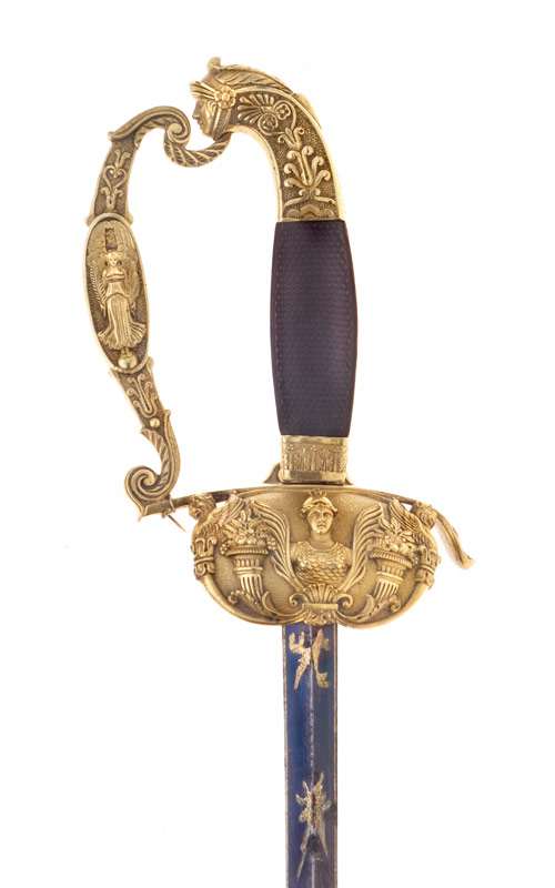Messinggefäss, aus gegossenen und ziselierten Teilen zusammengesetzt, vergoldet, berieben. Vierkantige Knaufkappe mit behelmtem Kopf als Abschluss, seitlich Palmetten u.a. ornamentaler Dekor. S-förmig geschweifter, flacher Griffbügel, gewinkelt in die Parierstange übergehend. In der Mitte des Griffbügels ein grosses ovales Medaillon mit der Darstellung der geflügelten Siegesgöttin. Die ebenfalls flache, vierkantige Parierstange endet in einer Palmette. Das ortwärts gebogene, stark gewölbte ovale Stichblatt weist seitliche Abschlüsse mit geflügelten Löwen auf. Stichblattdekor: vor einem fein punzierten Grund in der Mitte eine Athenabüste zwischen Palmzweigen und grossen mit Früchten gefüllten, lorbeergeschmückten Füllhörnern. Der vierkantige, geschwärzte Holzgriff ist etwas berieben, Vorder- und Rückseite mit geschnittenem Fischhautmuster, Seitenflächen glatt, Zwinge.