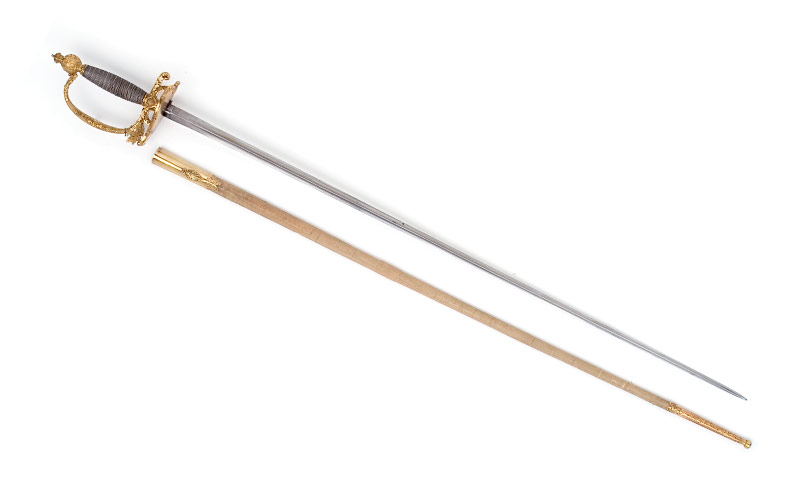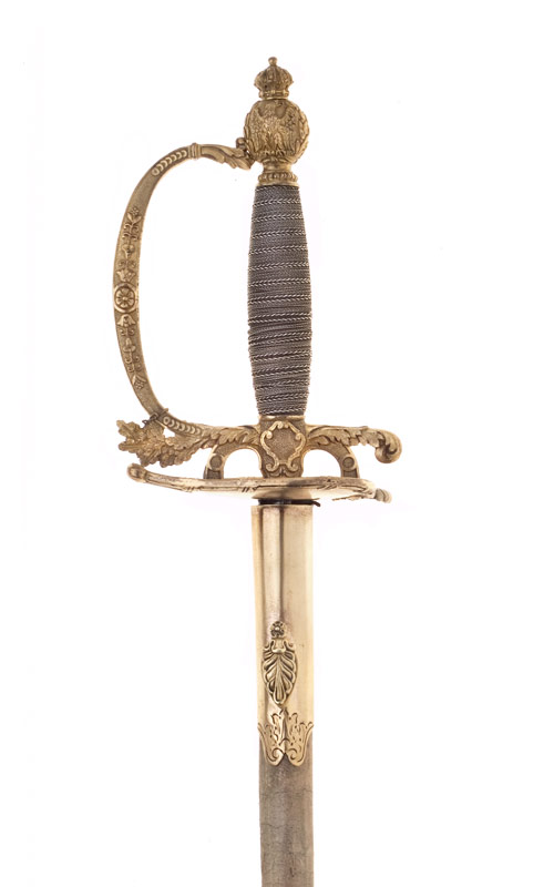 Verschraubtes Messinggefäss aus gegossenen und ziselierten Teilen, vergoldet. Kugeliger Knauf, Halsansatz über einer konischen Basis mit Würfelfries. Terz-und Quartseite des Knaufs mit einer Darstellung des auf einem Blitzbündel sitzenden kaiserlichen Adlers, seitlich Lorbeerzweige. Der abschraubbare Vernietknauf hat die Form der französischen Kaiserkrone. Der flache, vierkantige, ornamental dekorierte Griffbügel mündet in die Griffbasis, Parierstangenarm von Blattwerk bedeckt, zwei flache Ziergriffhaken. Zwischen dem Griffbügelansatz und dem einen Ziergriffhaken wurde als ein weiteres Dekorelement ein Eichenlaubzweig eingesetzt. Herzförmiges Stichblatt mit Zentrumsmuschel , das Stichblatt teilt sich gegen den Griffbügel und geht in Lappenfortsätze über. Stichblattborte etwas gewulstet mit doppelter Zierrille. Auf der Unterseite eine geschlagene Marke, «AB» in Rechteck, zwischen den beiden Buchstaben ein Zeichen, «Dolch» (?). Griff mit feiner Silberdrahtwicklung.
