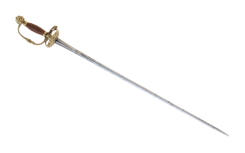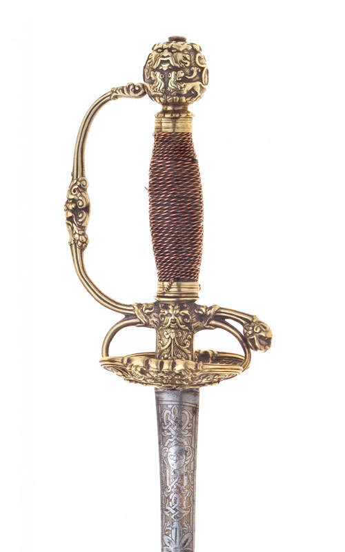 Messinggefäss, aus gegossenen und ziselierten Teilen zusammengesetzt. Kugeliger Knauf, kurzer Halsansatz, Vernietknauf. Dekor reliefiert, etwas berieben: auf der Terz- und Quartseite Darstellung von zwei Löwen darüber ein grosser Maskaron. Der profilierte Griffbügel im Mittelteil mit Maskaron mündet über einen Hydrakopf in die Griffbasis, welche beidseitig Maskarons über einer stilisierten Blume schmücken. Kurzer, einem Hydrakopf entwachsender und in einem Löwenkopf endender Parierstangenarm, zwei Griffringe. Das Stichblatt besteht aus zwei nierenförmigen Hälften, welche in der Mitte der Bordüre innen und aussen Maskarons aufweisen. Symmetrisch angelegter Stichblattdekor: innen - barockes Rankenwerk und seitliche Maskaronabschlüsse, aussen - zwei Löwen und barockes Rankenwerk. Griff mit Kupferdrahtwicklung, Messingzwingen.